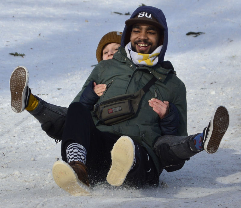 Dat openbaar bezit onopzettelijk her en der werd vernield, werd door de mensen voor lief genomen. Dat hoort nu eenmaal bij sneeuwpret en de gegeven plaatselijke omstandigheden. Ook dit is democratie. Indien ’s zomers met mooi weer op hetzelfde tijdstip vandalen zouden besluiten dezelfde vernielingen aan te brengen, dan zou bij een dergelijke massa mensen ongetwijfeld de politie worden ingeschakeld en door de mensen met hun mobieltjes opnames worden gemaakt. Ook dit zou democratie zijn. De sneeuwpret gaf de vreugde en het plezier waar de mensen naar zochten in deze donkere tijden. De gezichten op onderstaande foto’s spreken voor zich. (lees verder onder de foto’s)